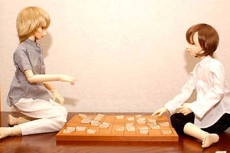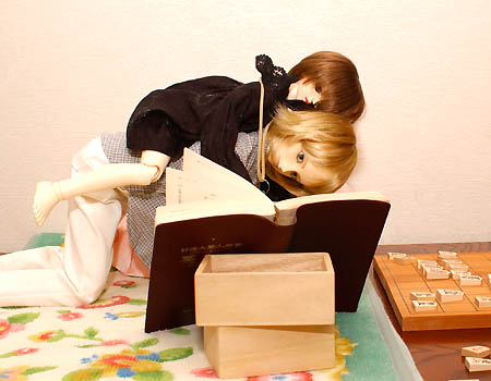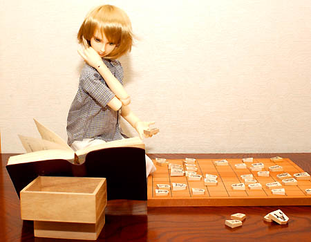将棋指南書を見ながら真剣に勉強するイエス。 |